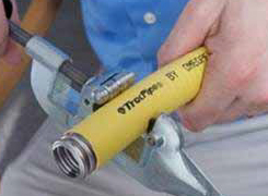 Afin de faciliter l’installation, le métré est indiqué sur les tuyaux TracPipe®. Utilisez un coupe tube avec une molette en acier inoxydable. Coupez simultanément la gaine en polyéthylène et le tuyau PLT en acier inoxydable en s’assurant d’être toujours positionné entre deux ondulations. Tournez plusieurs fois le coupe-tube dans une seule direction autour du tuyau en resserrant légèrement la pression de la molette (un quart de tour) après chaque tour complet. Réalisez une coupe nette sans bavures. Ne pas utiliser une scie à métaux pour couper le tuyau TracPipe ®.